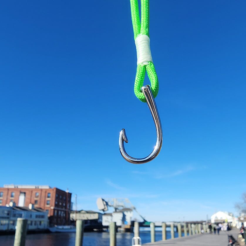 You fish, boat and sail, we've got you covered with this new addition to our nautical bracelet collection. Lime rope and the nautical stainless steel fish hook bracelet whipped with a white detail. Made in Mystic with an authentic Mystic Knotwork custom fish hook, curved to gently fit your wrist. Time to get your fish on!